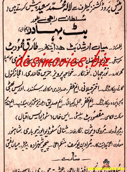 Starring: Najma, Sultan Rahi, Ishrat Chaudhary, Afzaal Ahmad, Adeeb, Sabiha, Yasmin Khan, Imrozia, Aslam Parvez, Mustafa Tind, Altaf Khan, Iqbal Durrani, Changezi, Hanif, Ilyas Kashmiri